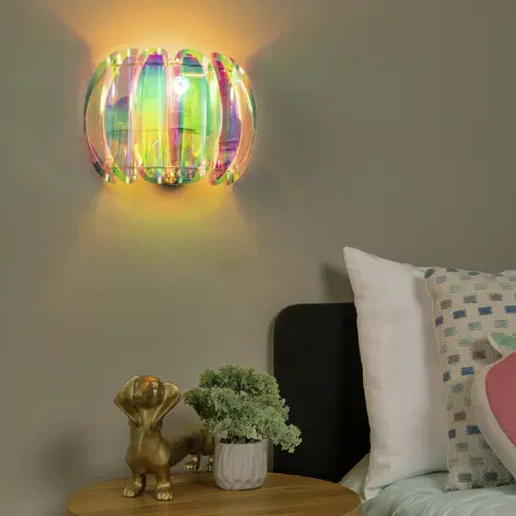 Det fortryllende utseendet til Glinstar er fengslende fra første øyeblikk du ser det. Denne unike vegglampen, laget av høykvalitets belagt PVC, har en virkelig spesiell regnbueeffekt. Velger du en dimbar LED-lyspære, kan du også koble denne magiske lampen til en dimmer for å skape en fortryllende atmosfære.