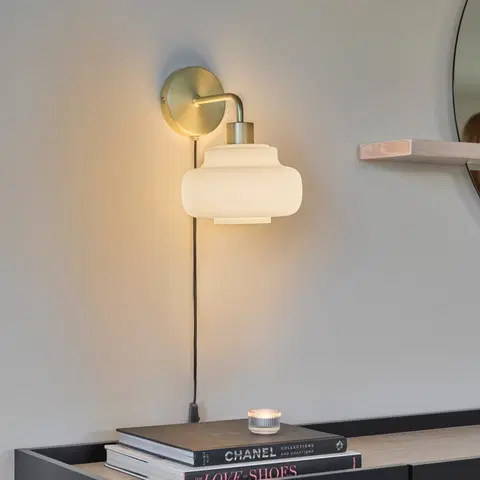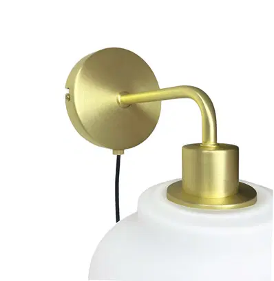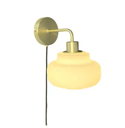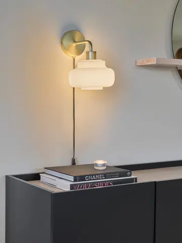 Soria er en elegant vegglampe som kombinerer tidløst design med funksjonell belysning. Den runde skjermen i opalglass gir et mykt og behagelig lys, mens detaljer i messing tilfører et eksklusivt preg. Perfekt som stemningsbelysning i stue, soverom eller gang.