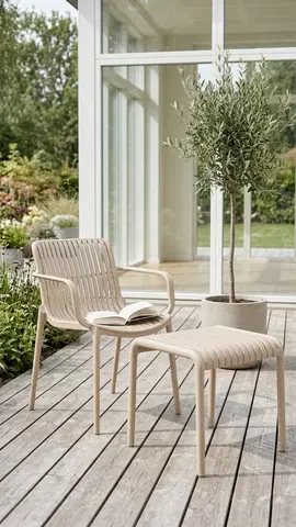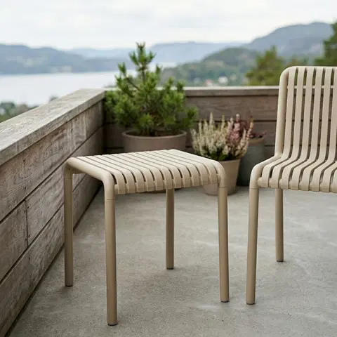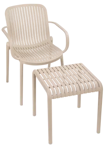 Capri bord i beige er et stilrent og funksjonelt utebord. Med sitt moderne design, myke former og ribbede bordplate, gir det et lett og luftig uttrykk som passer inn i de fleste utemiljøer.