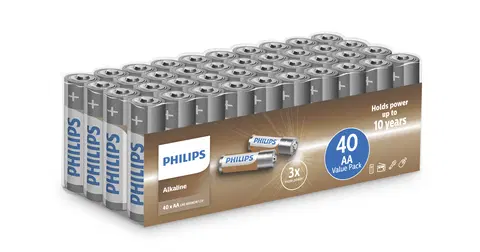 Philips Power Alkaline-batterier gir strøm til elektroniske produkter som krever mer energi enn noensinne. Denne pakken med 40 stykker alkaliske AA-batterier fra Interna-serien holder elektroniske leker og bærbar lyd gående lenger. Alkalisk teknologi gir lang batterilevetid og jevn ytelse, selv i kraftkrevende enheter.