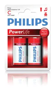 Pakken inneholder to stykker LR14-batterier, som passer til ulike typer elektrisk utstyr. Philips Power Alkaline-batterier er fremstilt uten helseskadelige stoffer som kadmium, kvikksølv og bly, noe som gjør dem trygge å bruke. Disse batteriene er kompatible med et bredt utvalg elektroniske produkter.