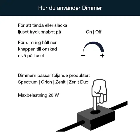 Tilpass lysstyrken på dine Plug & Play-lamper fra LightsOn med denne praktiske dimmeren. Med et enkelt grep justerer du lysintensiteten til ønsket nivå, om du vil ha en koselig demring eller mer kraftig belysning. Dimmeren starter på samme lysstyrke som du senest satte, slik at du slipper å lete etter riktig nivå hver gang. Dette tilbehøret er designet for Spectrum, Orion, Zenit og Zenit Duo fra LightsOn Plug & Play-serien og har en maks belastning på 20W. Dimmeren har en praktisk lengde på 33 cm inkludert ledning, noe som gir god rekkevidde. Med IP44-klassifisering er den beskyttet mot vannsprut og kan brukes både inne og ute. Denne sortlakkerte dimmeren er et must for deg som vil ha full kontroll over lysstyrken på dine LightsOn-lamper.