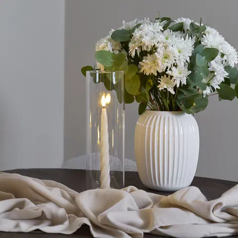 Lykten er 32 cm høy og laget i klart, tykt glass som beskytter flammen og samtidig lar lyset skinne vakkert gjennom. Den egner seg like godt til levende lys som til LED-stearinlys – ideell for koselig belysning på bord, gulv eller i vinduskarmen.