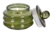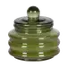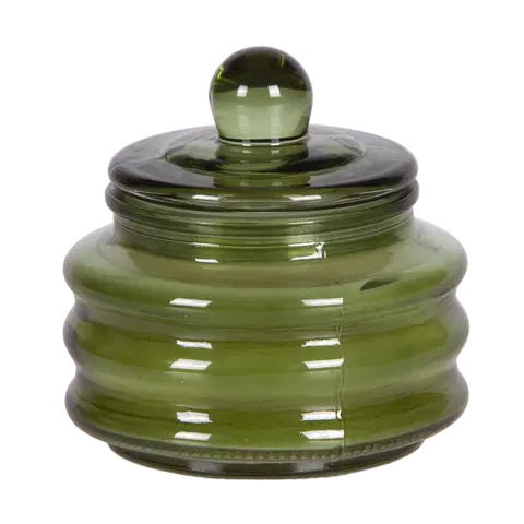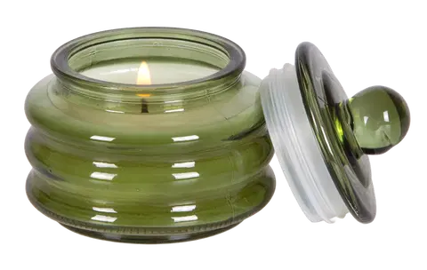 Lyset kommer i et vakkert grønt glass med lokk – både elegant og praktisk. Når lyset er brent opp, kan glasset gjenbrukes som dekorativ oppbevaring eller til telys.