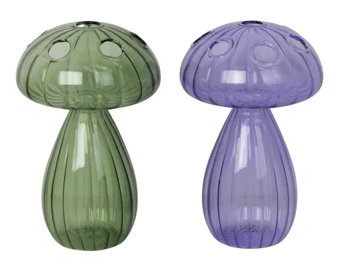 Denne unike dekorasjonen kombinerer en lekfull soppform med funksjonaliteten til en vase, laget av farget glass. Med sin kompakte høyde på 15 cm er den perfekt for små, lette blomster eller som et selvstendig dekorativt element i hjemmet.