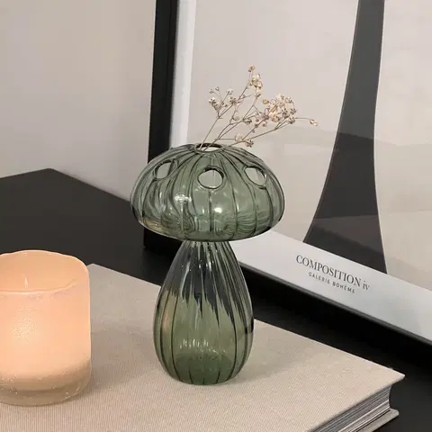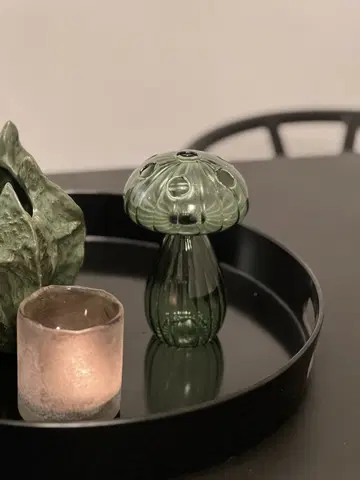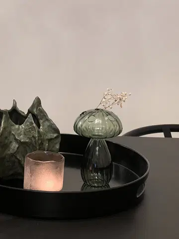 Dekorasjons-soppen fungerer utmerket til små blomsterstilker, grener eller tørkede blomster, og tilfører rommet et snev av lekenhet og eleganse. Bruk den alene, eller kombiner den med andre dekorative glassobjekter for et gjennomført og harmonisk uttrykk.