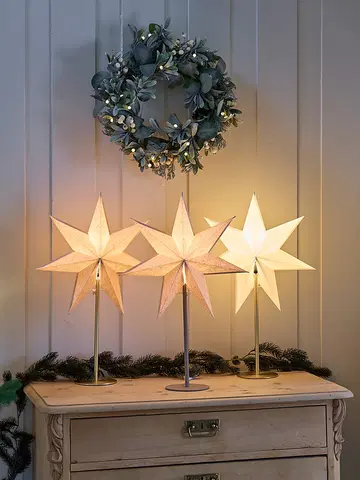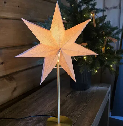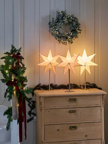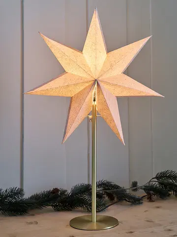 Med en høyde på 55 cm og en stjernebredde på 40 cm, passer den perfekt på kommoder, vinduskarmer eller sidebord. Adventstaken bruker en E14-pære (maks 15W, 230V) og leveres med 2 meter ledning med bryter, som gir fleksibel plassering i hjemmet. Den er klasse II godkjent for trygg bruk.
