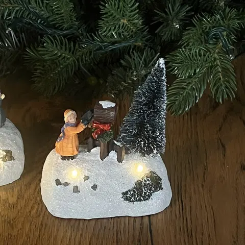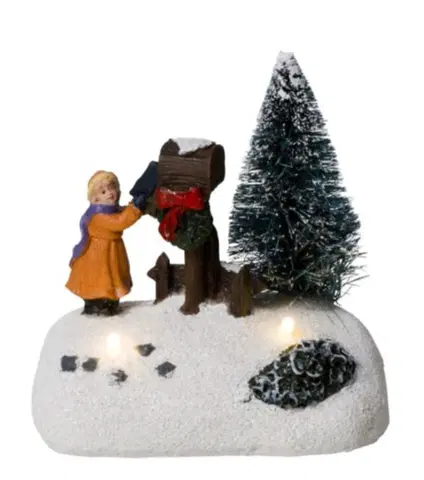 Denne juledekorasjonen viser en søt jente som står ved siden av en klassisk postkasse, klar for å sende julebrev og ønsker. Med sin detaljerte utforming og fargerike design bringer den en nostalgisk følelse av julens tradisjoner. To varmehvite LED-lys lyser opp scenen med en myk og innbydende glød, og skaper en magisk atmosfære i rommet. Dekorasjonen drives av batteri (2 x AAA, medfølger ikke), noe som gjør den enkel å plassere hvor som helst uten behov for stikkontakt. Den praktiske timerfunksjonen lar deg enkelt programmere dekorasjonen til å lyse opp automatisk i ønsket tidsintervall. Laget av polyresin i flerfarget utførelse, måler den 10,5 cm i høyde, 8,5 cm i bredde og 7 cm i dybde. Med IP20-klassifisering og 1 års garanti er dette en robust og holdbar juledekorasjon.