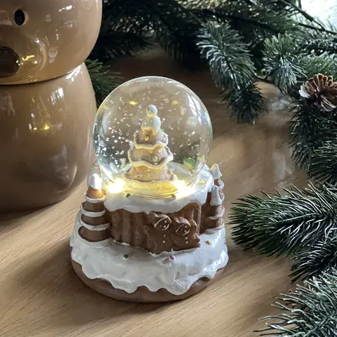 Denne sjarmerende pepperkake vannkulen vil bringe et ekstra snev av julemagien inn i hjemmet ditt. Inni finner du en nydelig liten pepperkakehus-scene opplyst av fire varmhvite LED-lys. Leken drives av batteri, så du kan plassere den hvor som helst uten å bekymre deg for ledninger. Med den praktiske timerfunksjonen kan du sette den til å lyse opp automatisk i ønsket tidsintervall.