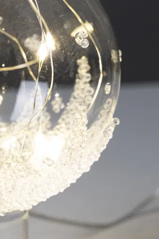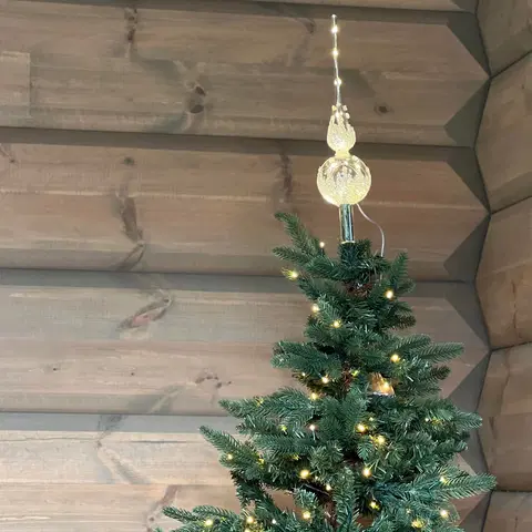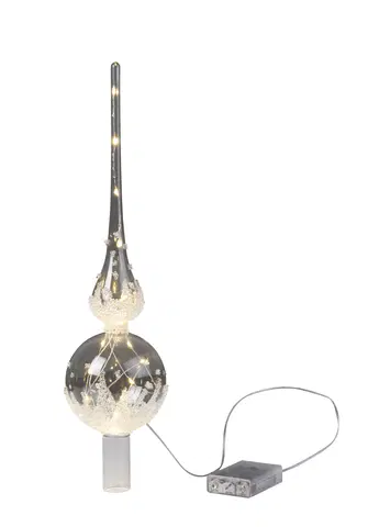 Tretopp spyd til juletreet med 10 varmhvite LED lys. Den er i klart glass med snø, og går på batterier (3 x AA medfølger ikke).